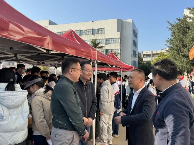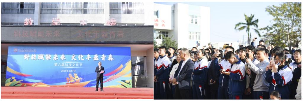 2026年1月7日下午,广东工业大学生态环境与资源学院副院长马金星教授、院长助理周扬副教授带队,联合物理与光电工程学院、信息工程学院、集成电路学院、材料与能源学院,赴汕尾市林伟华中学参加该校第六届科技文化节,通过科技项目展示、专业讲解与互动交流,让中学生们近距离感受我校的科技创新氛围与学科特色。
