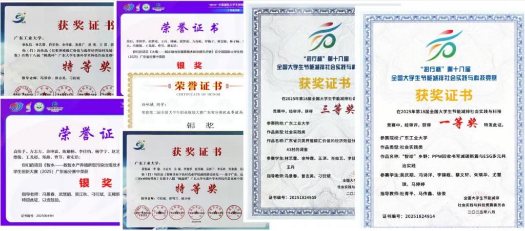 学院师生在各类高水平赛事中荣获10余项省级以上奖励,包括第十八届“挑战杯”广东大学生课外学术科技作品竞赛特等奖2项,第十八届全国大学生节能减排社会实践与科技竞赛国赛一等奖、三等奖各1项,中国国际大学生创新比赛(2025)广东省分赛银奖2项,第二届全国大学生职业规划大赛广东省分赛银奖1项,“星火乡传”实践团荣获广东省“国家资助和助学贷款政策下乡行”活动优秀实践队等。