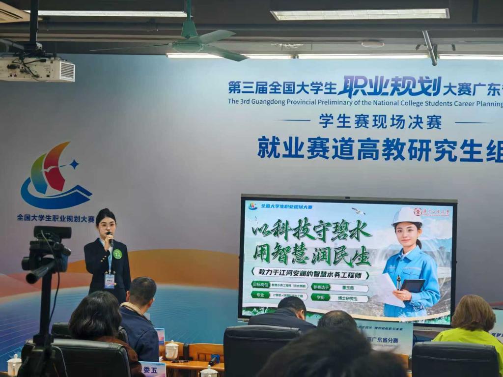 决赛现场,我院博士研究生董玉茹立足行业前沿,紧扣社会需求,依托扎实的实践经验,精准把握行业难点,提出创新性技术解决方案,充分展现了智慧水务工程师以科技兴水、以专业治水的初心使命。