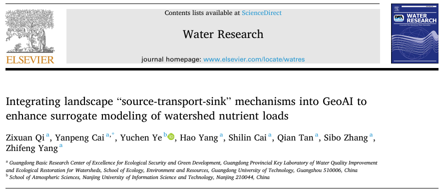 近期,我院杨志峰院士团队蔡宴朋教授课题组在Water Research上发表题为“Integrating Landscape "Source-Transport-Sink" Mechanisms into GeoAI to Enhance Surrogate Modeling of Watershed Nutrient Loads”的研究论文。蔡宴朋教授为论文通讯作者,我院博士后齐子萱为论文第一作者。