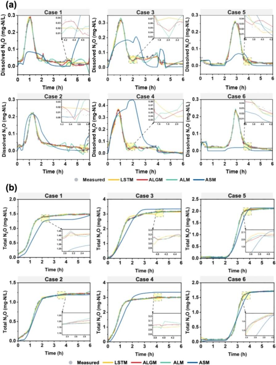 图2.混合模型对系统案例1-6中溶解态N2O(a)及总N2O(b)的模拟结果