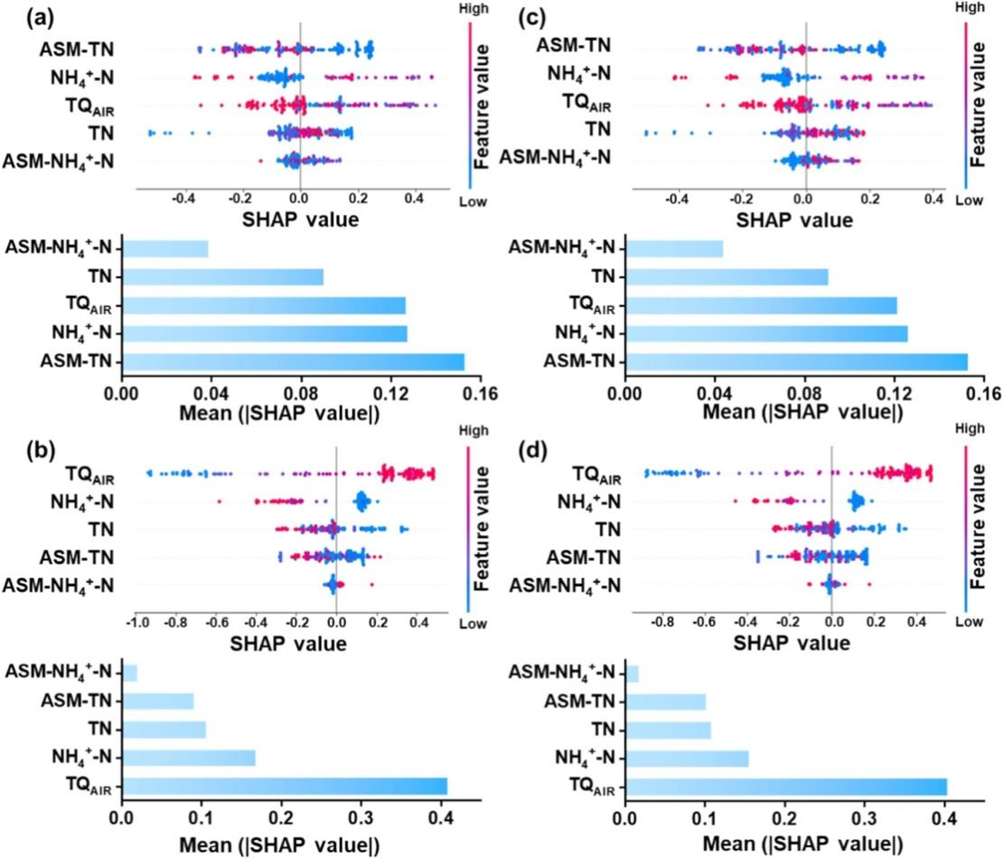 图3.影响因素的SHAP值及其对混合模型溶解态N2O(a)及总N2O(b)以及对比模型中溶解态N2O(c)及总N2O(d)的平均影响