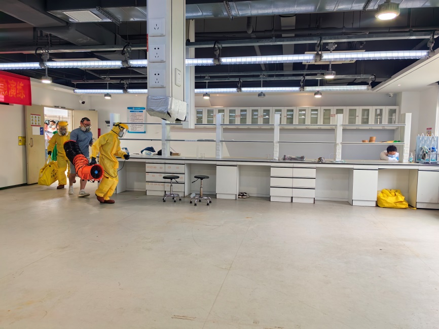安全培训在科技南楼一楼学术报告厅进行,张远副院长对与会的校实验室与设备管理处熊嘉雯老师和海尔生物医疗的李公海工程师表示了热烈欢迎和诚挚感谢。危化品的安全使用和综合管理培训内容有很强的警示效果,发人深思,培训现场师生踊跃参与问答互动。培训结束后,全体人员转移至科技北楼507-2实验室进行应急演练。曾志英书记亲临现场,根据危化品泄露应急预案,指挥救援行动。在参与演练的13名师生的通力配合下,应急演练顺利完成。演练结束后,现场进入“防化服穿脱接力赛”环节,通过激烈的比赛增进学生的应急救援能力,强化安全意识。